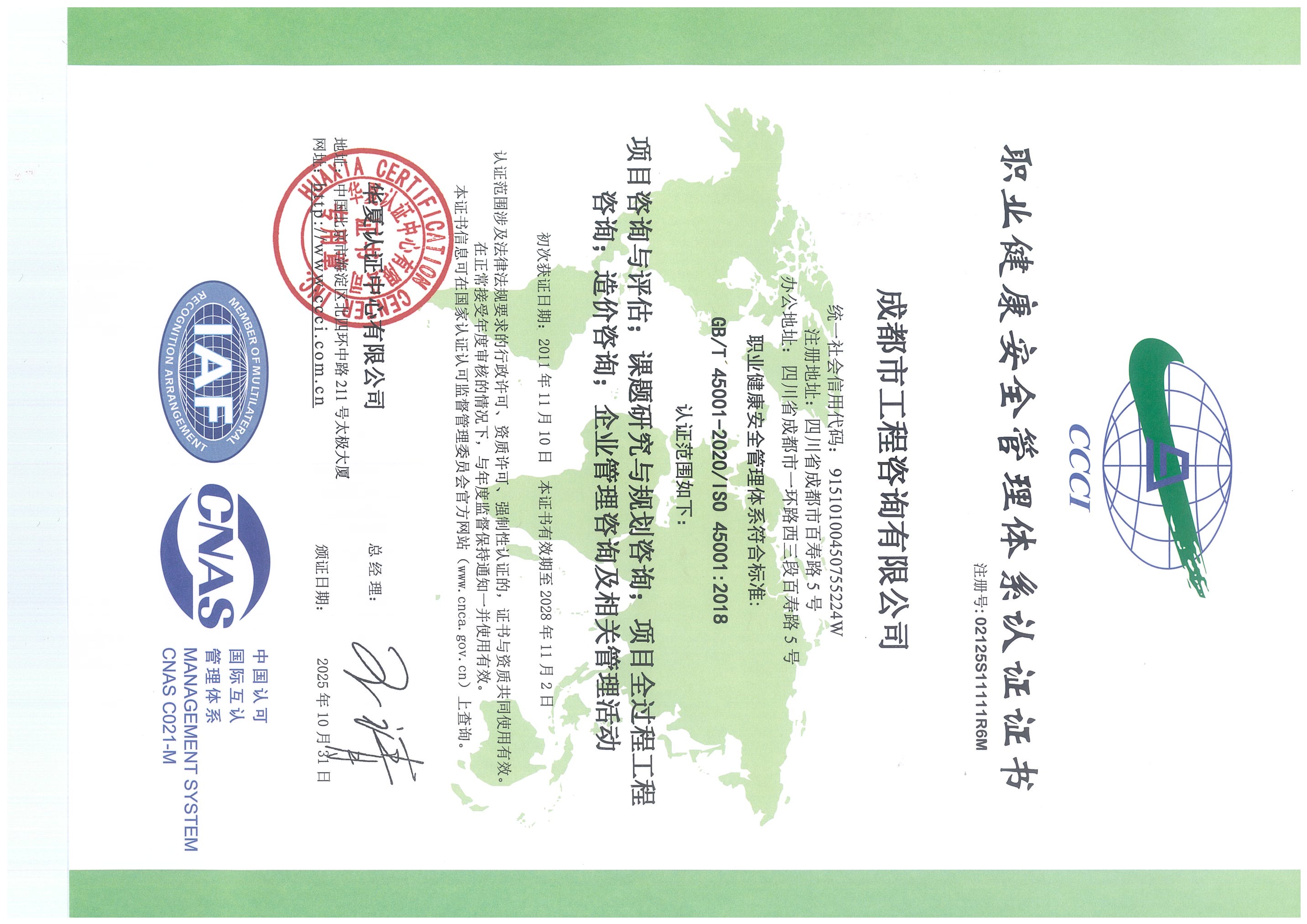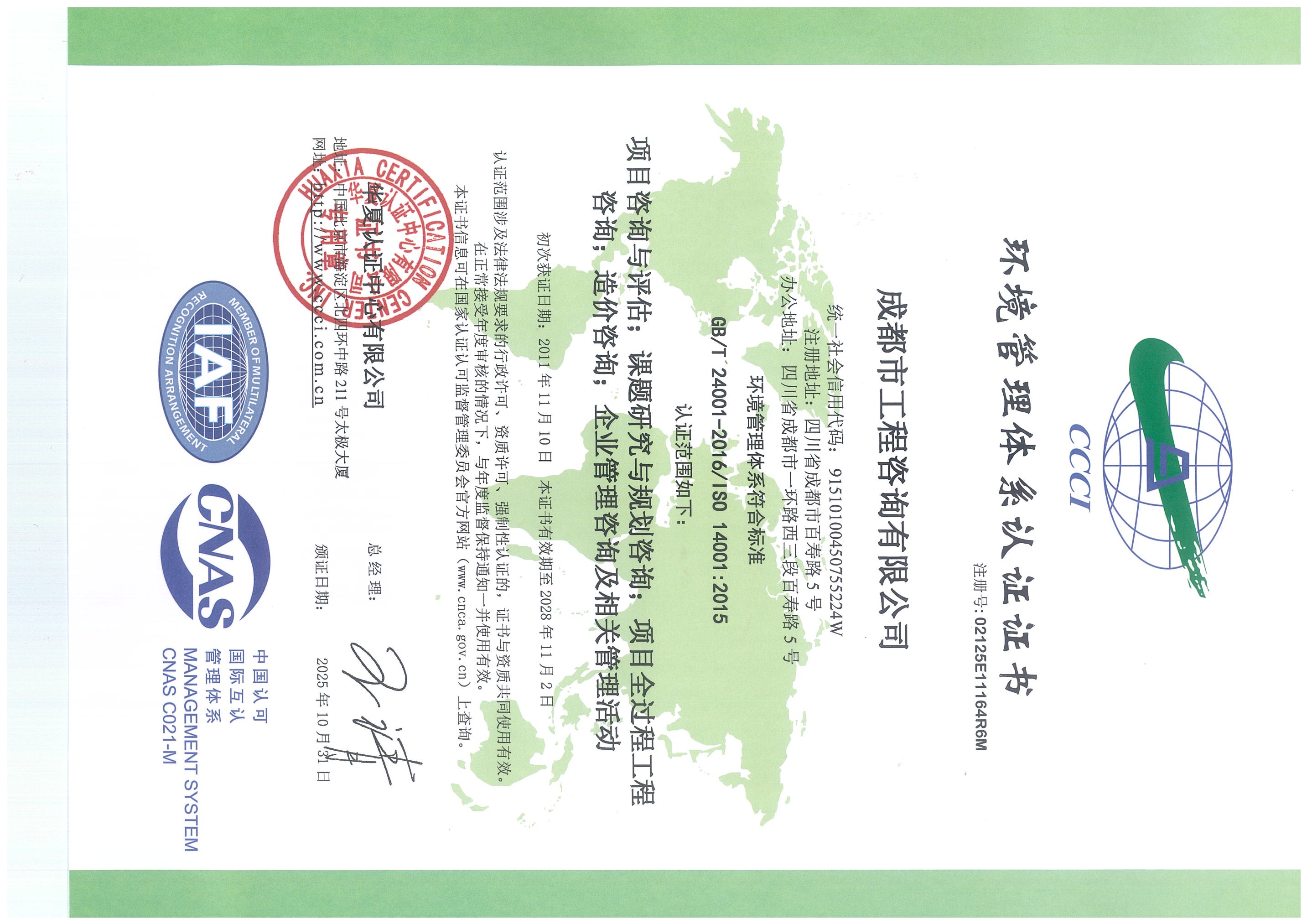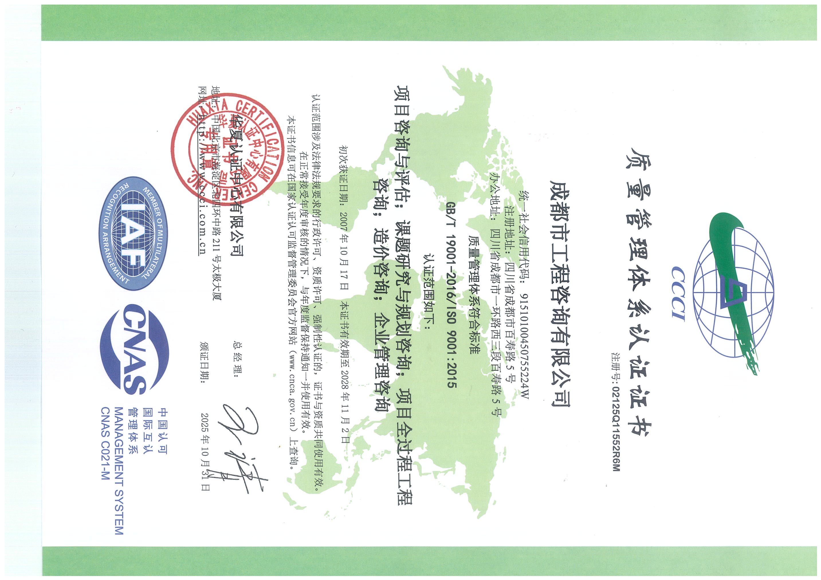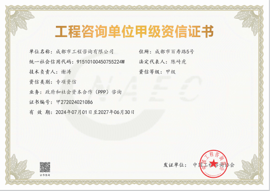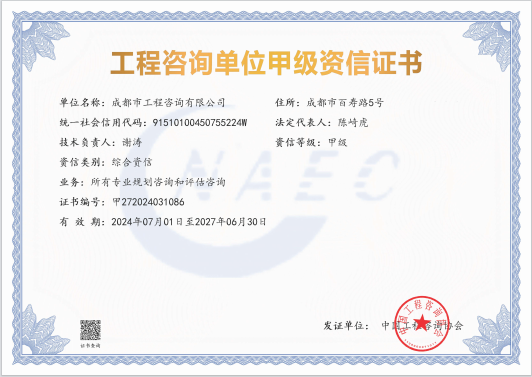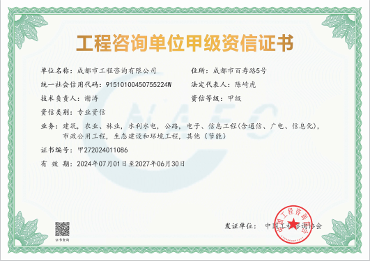 公司是四川省內唯一同時持有甲級綜合資信、甲級專業(yè)資信和PPP甲級專項資信證書的綜合咨詢機構,是四川省及成都市發(fā)展改革部門以及天府新區(qū)、東部新區(qū)、高新區(qū)、武侯區(qū)等20余個區(qū)(市)縣的政府投資項目咨詢服務機構公司擁有工程咨詢甲級綜合資信、甲級專業(yè)資信和PPP甲級專項資信三項甲級資信證書和工程造價資質甲級綜合資信由建筑,水利水電,農(nóng)業(yè)、林業(yè),電子、信息工程(含通信、廣電、信息化),市政公用工程,生態(tài)建設和環(huán)境工程,公路,其他(節(jié)能)8個甲級專業(yè)資信和電力(含火電、水電、核電、新能源),輕工、紡織,水文地質、工程測量、巖土工程,建材,鐵路、城市軌道交通,其他(土地整理)和其他(旅游工程)7個其他專業(yè)組成。公司現(xiàn)已通過了GB/T19001-2016/ISO9001:2015質量管理體系、GB/T24001-2016/ISO14001:2015環(huán)境管理體系和GB/T45001-2020/ISO45001:2018職業(yè)健康安全管理體系認證。
