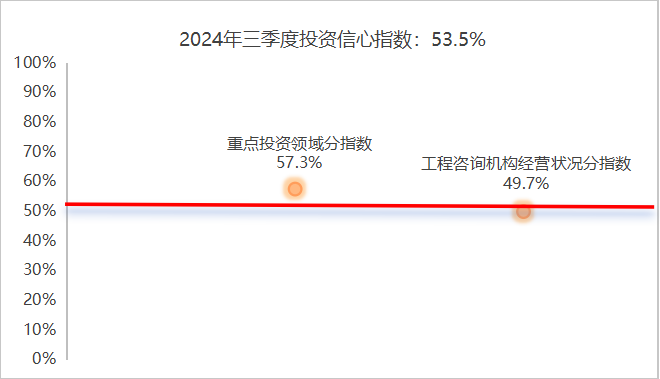 2024年三季度投資信心指數(shù)為53.5%,較二季度上升1%,投資信心向好。投資信心指數(shù)由重點(diǎn)投資領(lǐng)域分指數(shù)和工程咨詢機(jī)構(gòu)經(jīng)營(yíng)狀況分指數(shù)構(gòu)成,其中重點(diǎn)投資領(lǐng)域分指數(shù)對(duì)投資信心指數(shù)支撐作用明顯。
